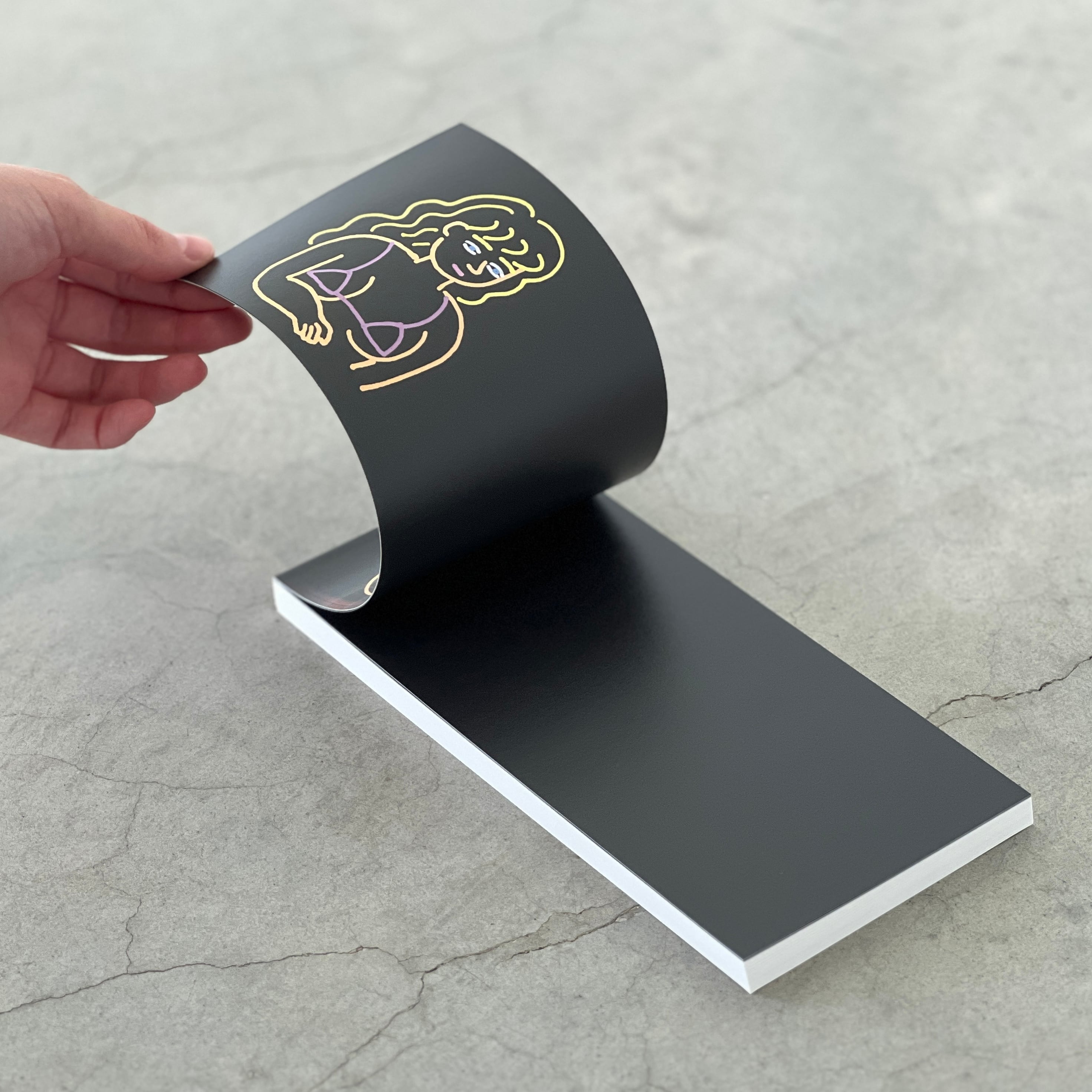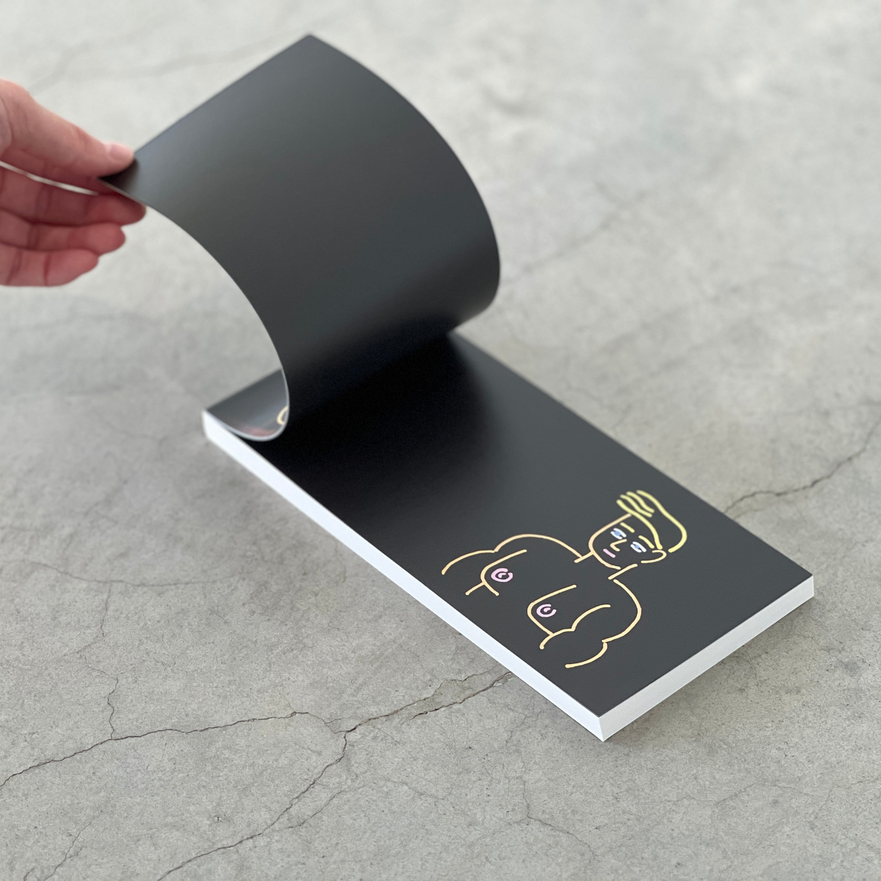 また中には、無地白ページのほかに黒地ページがあり作家のドローイングがプリントされています。